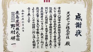 未分類 感謝状拝受 八潮市では発生した道路陥没事故の復旧工事において、弊社エンジニアリング事業部で復旧作業のお手伝いをさせて頂き、鹿島建設株式会社様より感謝状を頂きました。 2025.08.20 未分類