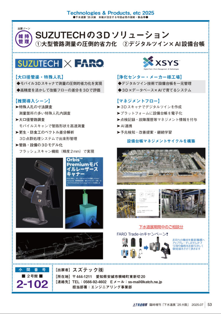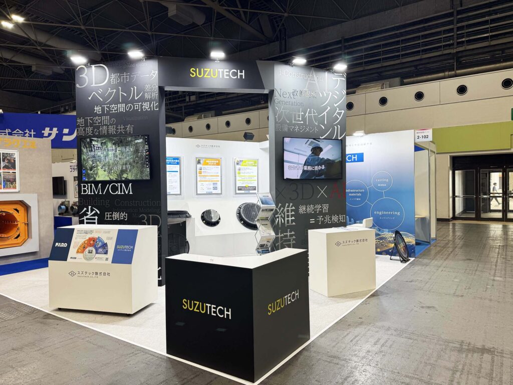 【下水道展‘25大阪】に出展しました 2025.08.192025.09.03 大変多くの関係者様に弊社ブースにお越し頂きました。誠にありがとうございました。 我々の活動フィールドである下水道市場において、昨年よりも今年こそDX元年ではないかと感じられる機会となりました。3D技術・デジタルツインを使ったDXソリューションは管路と処理場(公共プラント)向けで、提案させて頂きました。 高精度な3Dスキャナーの導入とアプリケーションの開発に、引き続き注力してまいりますので今後とも宜しくお願い致します。