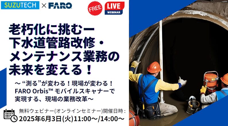 【SUZUTECK×FARO下水道管路の3D化】ウェビナーへ参加頂き、ありがとうございました! 2025.06.042025.09.03 大変多くの関係者様にご参加いただきありがとうございました。今後とも弊社が進める下水道の3Dソリューションについて引き続き情報発信してまいりますので、どうぞ宜しくお願いします。 老朽化に挑む-下水道管路改修・メンテナンス業務の未来を変える! FARO JAPANとスズテックでウェビナーを開催します。 【測るが変わる!現場が変わる!】 FARO Orbis™モバイルレーザースキャナーで実現する、現場の業務改革日時:2025年6月3日(11:00~・14:00~)